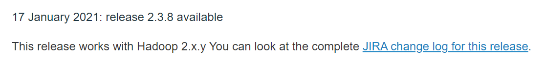 于是让人很难绷得住的事情发生了:这里集成的Hive版本怎么是2.3.9啊。为什么这么说?因为Hive是3.x.y对应Hadoop的3.x.y的。不信吗?看看人家的发行说明: