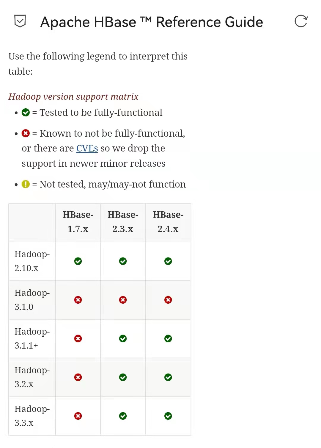 然后是HBase和Java的兼容性,忘了截图了,但Jdk8和11对于新一点的版本在兼容性上是基本没有问题的,太好了,不然从一开始的工作全部要……